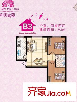 和美鑫苑93.00㎡B3户型两室两厅一卫户型2室2厅1卫
