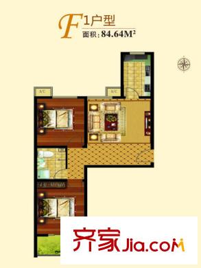 蓝湖郡84.64㎡F1户型两室一厅一卫户型2室1厅1卫