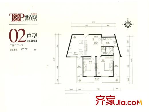 名人国际TOP世界观B单元02户型 2室2厅1卫1厨