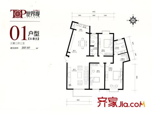名人国际TOP世界观B单元01户型 3室2厅2卫1厨