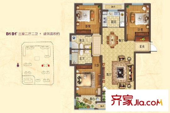 华中・假日丽城B1-B1`户型 3室2厅2卫1厨
