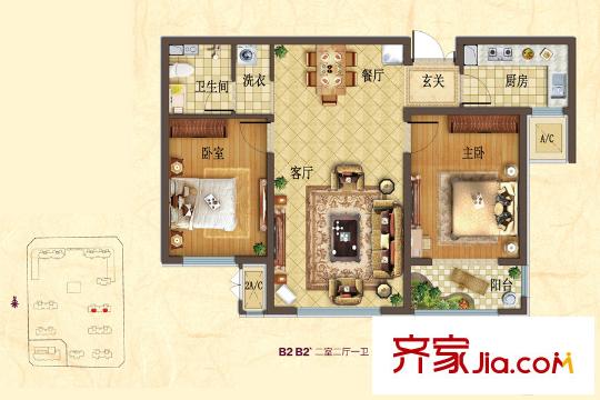 华中・假日丽城B2-B2`户型 2室2厅1卫1厨