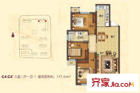 华中・假日丽城C4-C4`户型 3室2厅1卫1厨