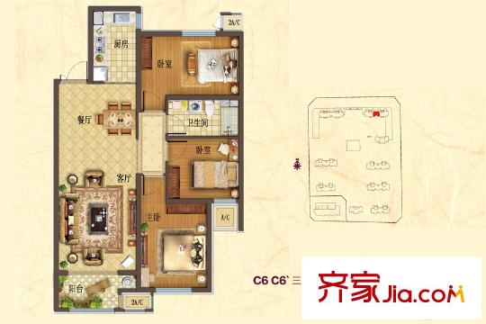 华中・假日丽城C6-C6`-户型 3室2厅1卫1厨