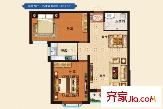 科华・锦绣城103.2平米户型 2室2厅1卫1厨