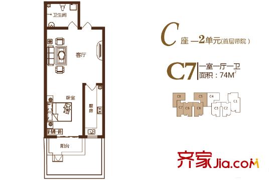 锦绣城二期C座2单元首层带院子C7户型 1室1厅1卫1厨