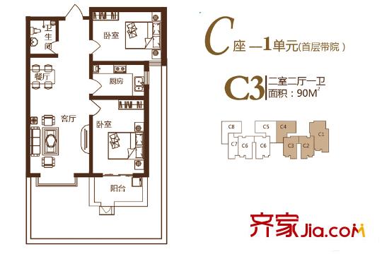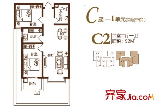 锦绣城二期C座1单元首层带院C3户型 2室2厅1卫1厨