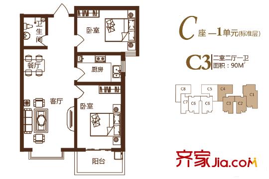 锦绣城二期C座1单元标准层C3户型 2室2厅1卫1厨