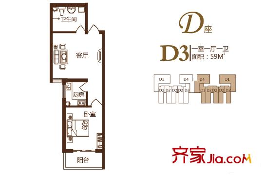 锦绣城二期D座D3户型 1室1厅1卫1厨
