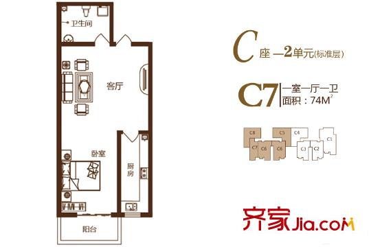 锦绣城二期C座2单元标准层C7户型 1室1厅1卫1厨