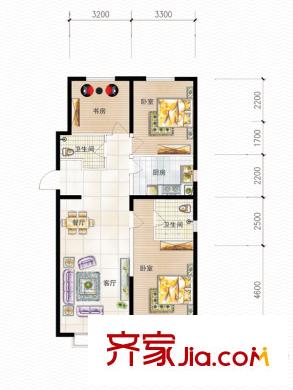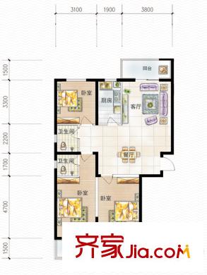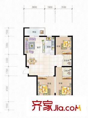 水畔明珠128.80㎡J户型三室两厅两卫户型3室2厅2卫