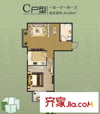 阳光绿城64.86㎡C户型一室一厅一卫户型1室1厅1卫