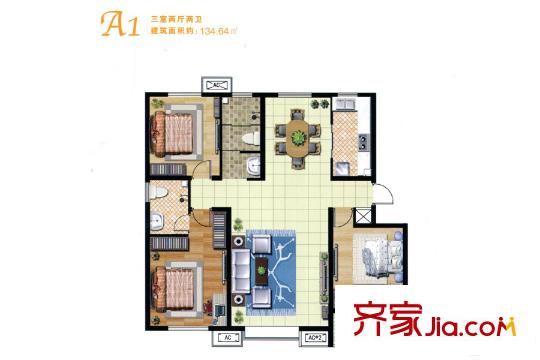 万和悦都A1户型 3室2厅2卫1厨