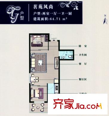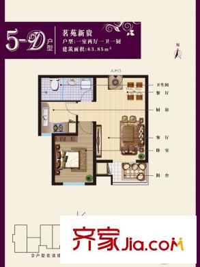 香溪茗苑63.85㎡5号楼D户型茗苑新贵户型1室2厅1卫