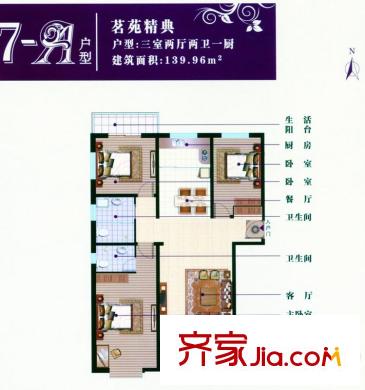 香溪茗苑户型图7-A户型 3室2厅2卫1厨