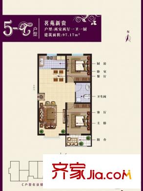 香溪茗苑97.17㎡5号楼C户型茗苑新贵户型2室2厅1卫