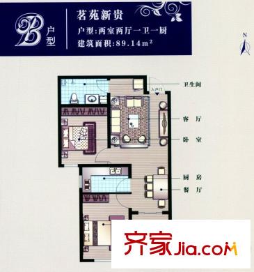 香溪茗苑88.91㎡2-B户型两室两厅一卫户型2室2厅1卫