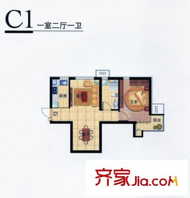 九号国际城高层C1平方米型 1室2厅1卫1厨