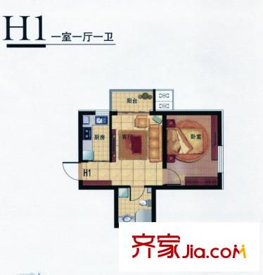 九号国际城高层H1平方米型 1室1厅1卫1厨