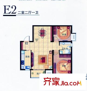 九号国际城售完高层E2平方米型 2室2厅1卫1厨