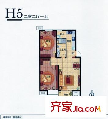 九号国际城103.80㎡h5两室两厅一卫户型