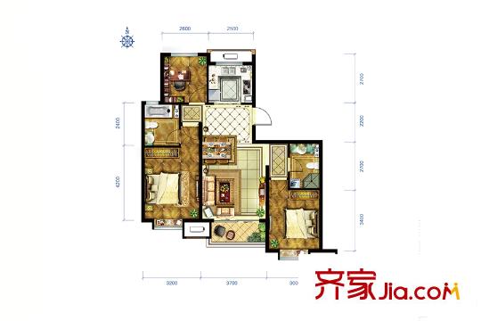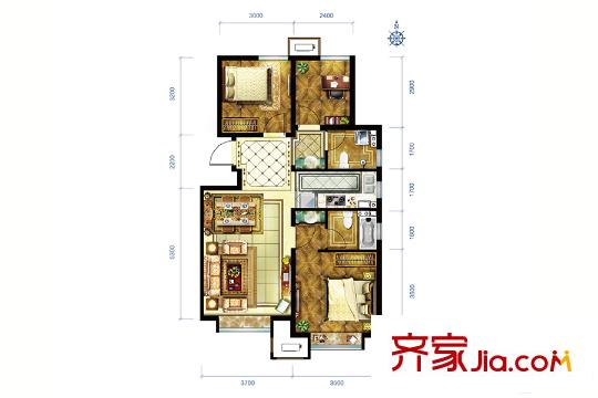 孔雀城・湖韵澜湾D户型图 3室2厅2卫1厨