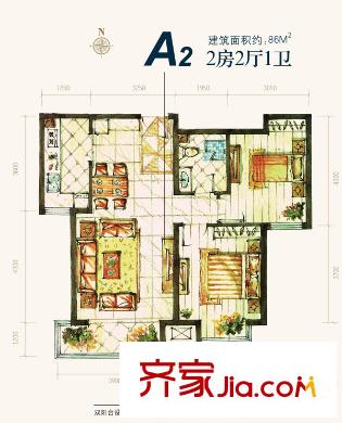 金海・太阳公园二期A2户型图 2室2厅1卫1厨