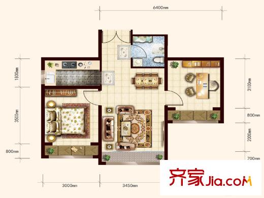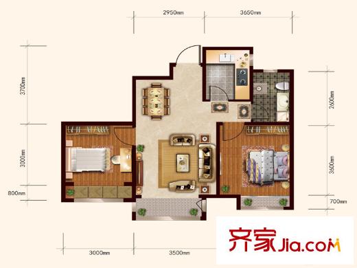 汇福悦榕湾一期6、9、#2-E户型 2室2厅1卫1厨