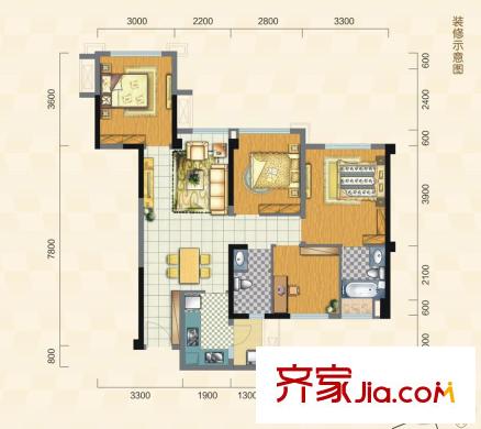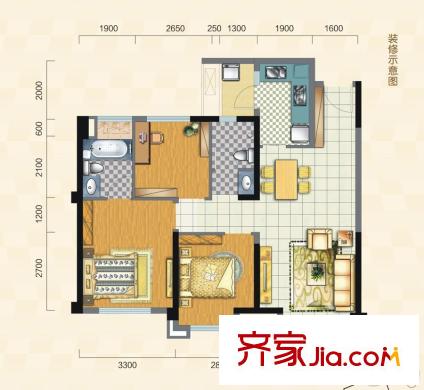蓝润V客平方米区一期1、2号楼标准层C3`户型 3室2厅2卫1厨