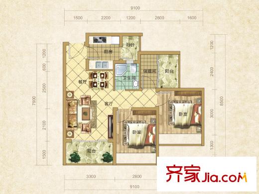 永缘格林波特一期洋房7号楼D5户型 2室1厅1卫1厨