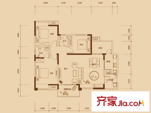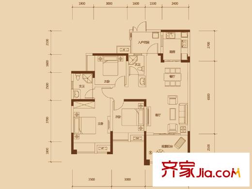 首创鸿恩国际生活区三期户型图高层2、3、5、6号楼标准层F2户型 3室2厅2卫1厨