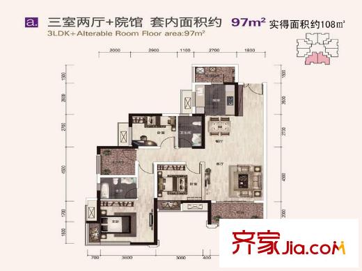 保利江上明珠畅园户型图一期9号楼标准层A户型 3室2厅2卫1厨