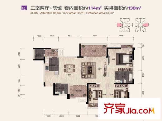 保利江上明珠畅园户型图一期9号楼标准层E户型 3室2厅2卫1厨