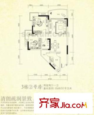 水务龙城天都户型图3栋2号房 2室2厅1卫1厨