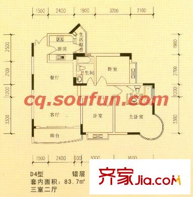 鸳鸯北湖郡户型图D4型错层 3室2厅2卫1厨