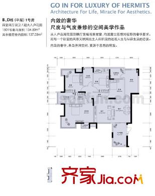 融科海阔天空户型图B、D栋平层1号房 4室2厅2卫1厨