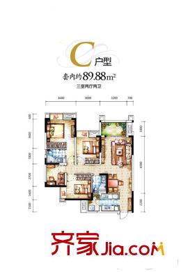 融汇温泉城童话里一期D区4号楼C户型 3室2厅2卫1厨