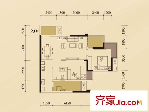 融科金湖湾一期3/4/5号楼3-28层A2户型 2室2厅1卫1厨