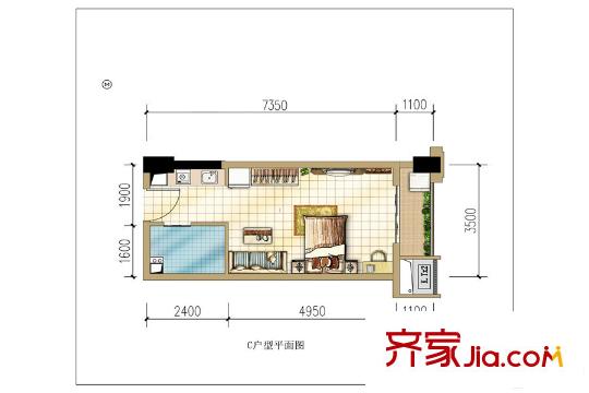 中航翡翠城一期高层27号楼标准层C户型 1室1厅1卫1厨