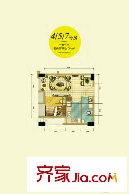 中航翡翠城二期高层26号楼标准层4、5、7号房户型图 1室1厅1卫1厨