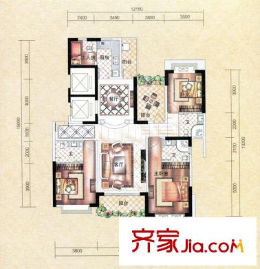 锦绣山河四期1#2单元02户型图 3室2厅3卫1厨