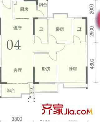 君御水漾年华户型图02座04单位 3-16层 3室2厅1卫