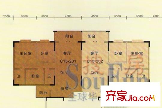 景泰花园户型图C15平面图2 3室2厅2卫1厨