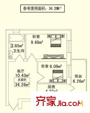 金泰蓝郡户型图三期:两室一厅一卫34.26平方米 2室1厅1卫1厨