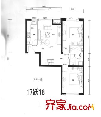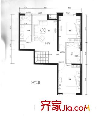 军创凯旋城户型图2号楼F户型跃层2层 2室1厅2卫