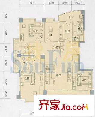 中央丽城户型图J座一单元1-16层 5室2厅3卫1厨