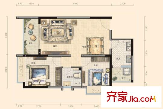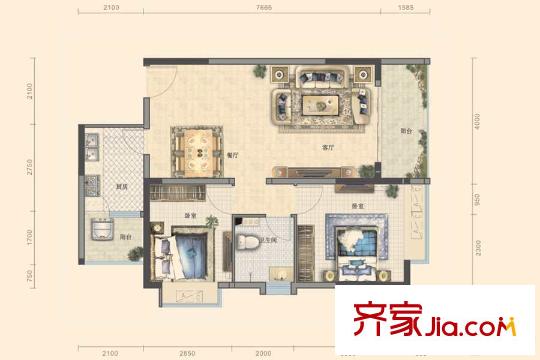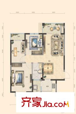 景园・悦海湾3.4.6栋C2户型82.2平米 2室2厅1卫1厨