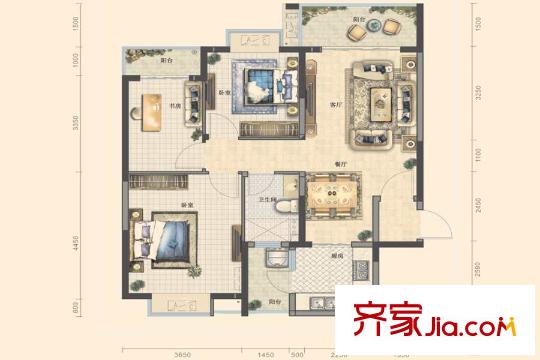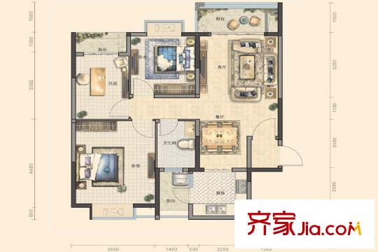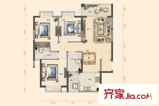 景园・悦海湾3.4栋D1户型96.71平米 3室2厅1卫1厨