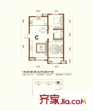 名仕雅苑二期1、6号楼C户型 3室2厅1卫1厨