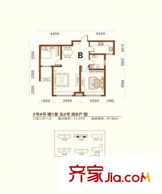名仕雅苑二期2、8号楼B户型 2室2厅1卫1厨